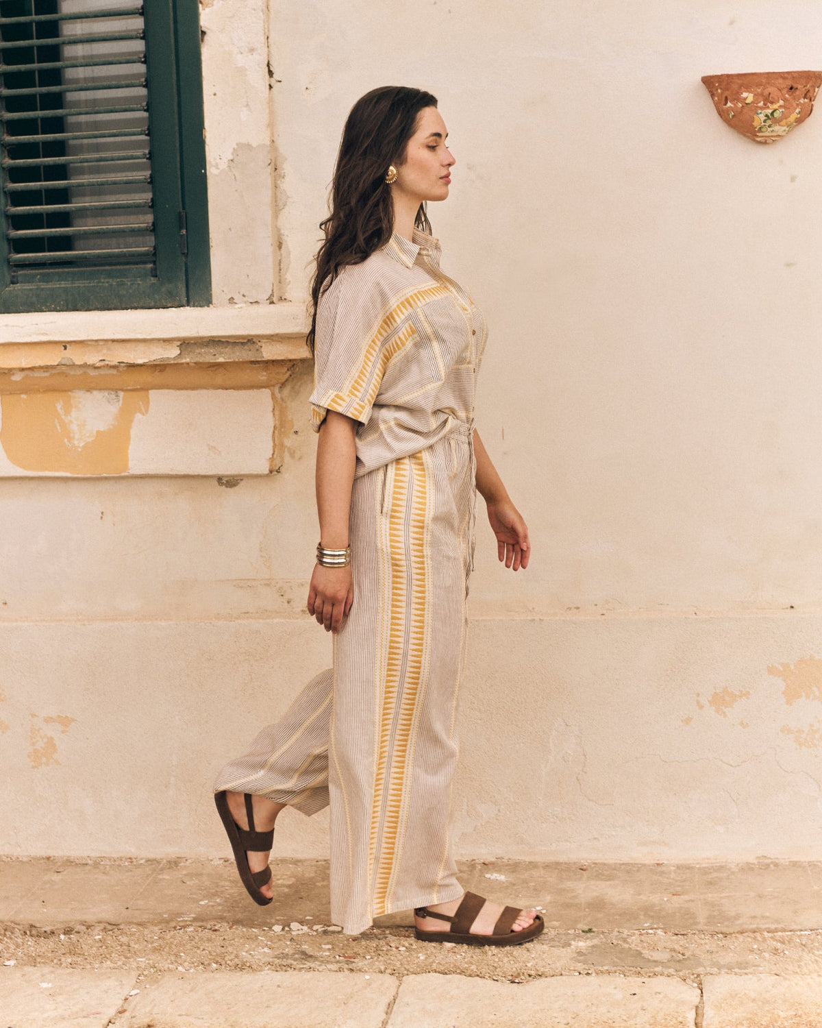 Imaginez un matin ensoleillé sur la côte amalfitaine. Un souffle de lin, une nuance camel brûlée par le soleil, et un imprimé qui fait danser les souvenirs de vacances.