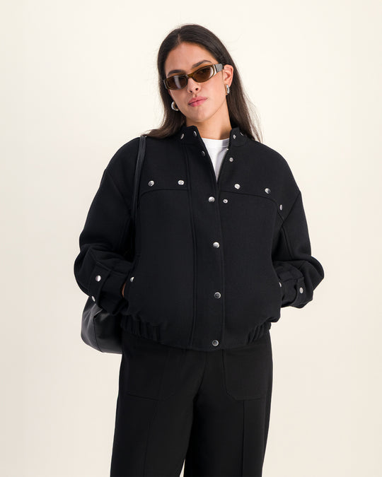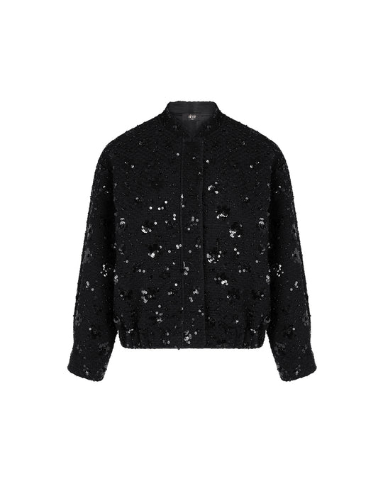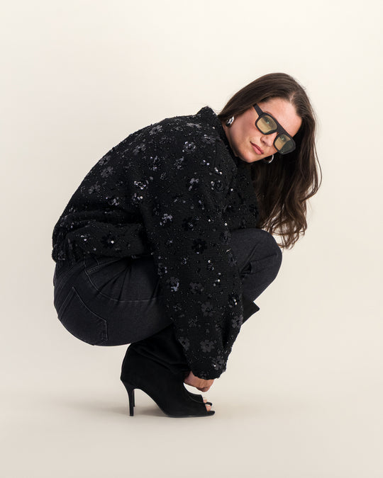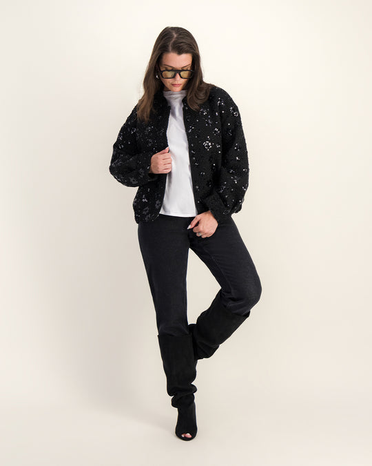 Une veste bomber chic pensée pour allier confort, brillance et allure moderne, à adopter aussi bien de jour que de nuit.