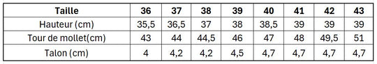 Comme pour nos vêtements, nous avons conçu nos chaussures pour s’adapter naturellement à toutes les morphologies. Pour les bottes, une bande élastiquée discrète assure un fit parfait en suivant les courbes du mollet pour un confort optimal. Vous pouvez consulter les mesures détaillées pour chaque pointure sur la fiche produit, afin de vérifier leur ajustement parfait pour vous. Les mocassins et les bottines sont également pensés pour convenir à des pieds larges.
