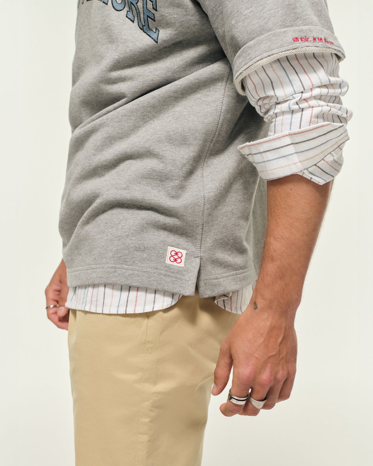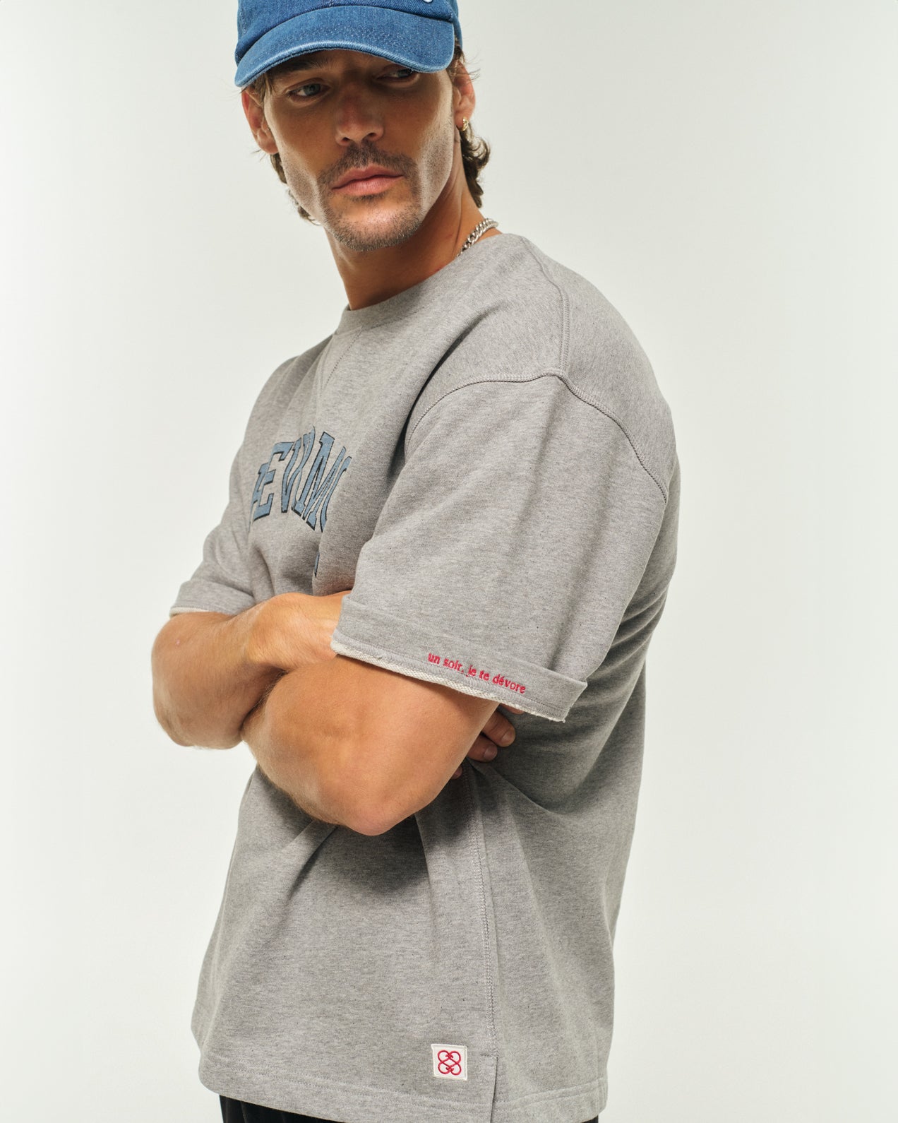 • Message brodé "un soir, je te dévore" à l'intérieur de l'ourlet de la manche gauche